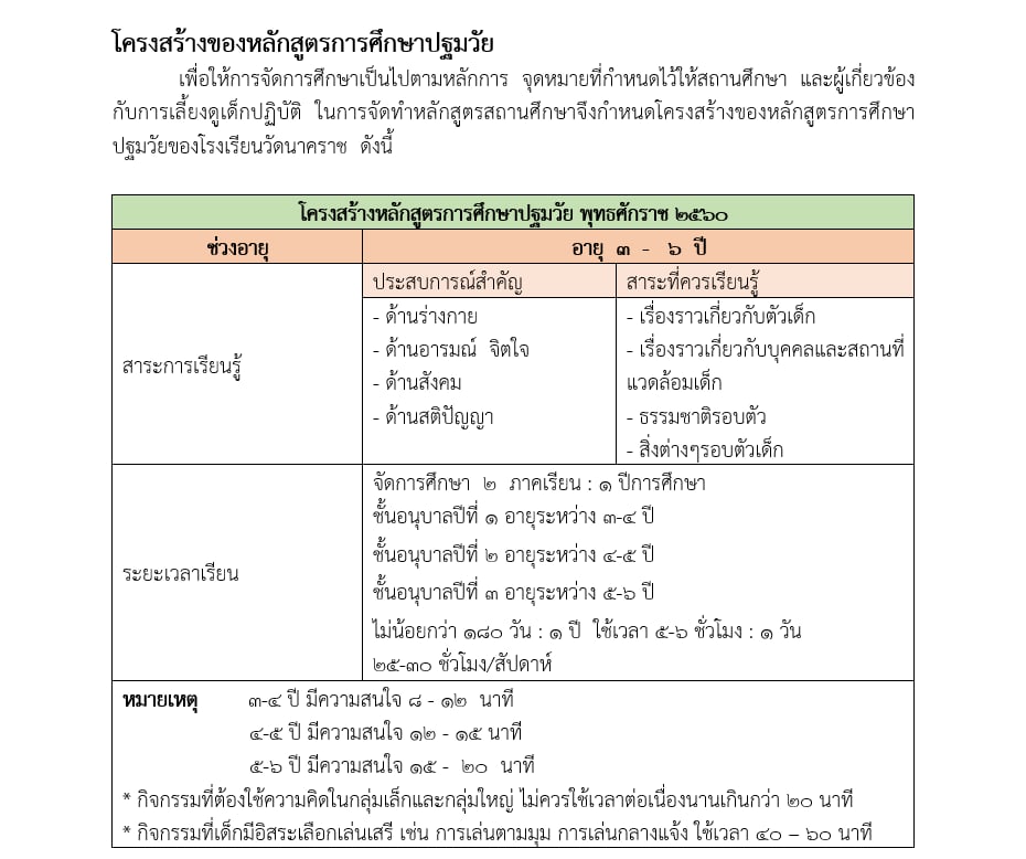 | ระดับปฐมวัย หลักสูตรการศึกษาปฐมวัย พุทธศักราช 2560 ระดับประถมศึกษา หลักสูตรแกนกลางการศึกษาขั้นพื้นฐาน พ.ศ. 2551 โดยมี 8 กลุ่มสาระการเรียนรู้หลัก ได้แก่ ภาษาไทย คณิตศาสตร์ วิทยาศาสตร์และเทคโนโลยี สังคมศึกษา ศาสนา และวัฒนธรรม สุขศึกษาและพลศึกษา ศิลปะ การงานอาชีพ และภาษาต่างประเทศ และมีรายวิชาเพิ่มเติมดังนี้ ภาษาอังกฤษเพื่อการสื่อสาร คอมพิวเตอร์ เสริมทักษะอ่านเขียน และการป้องกันการทุจริต |